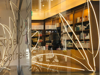 The LichtBLÄTTER shine far and can be seen from the Hypo-Kunsthalle across the street, illuminating the street in front of the pharmacy and its interior at the same time.